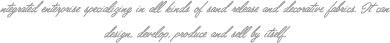 從事各類沙發(fā)布、裝飾布的工貿(mào)一體化企業(yè),可自行設(shè)計(jì)、開(kāi)發(fā)、生產(chǎn)、銷售。
